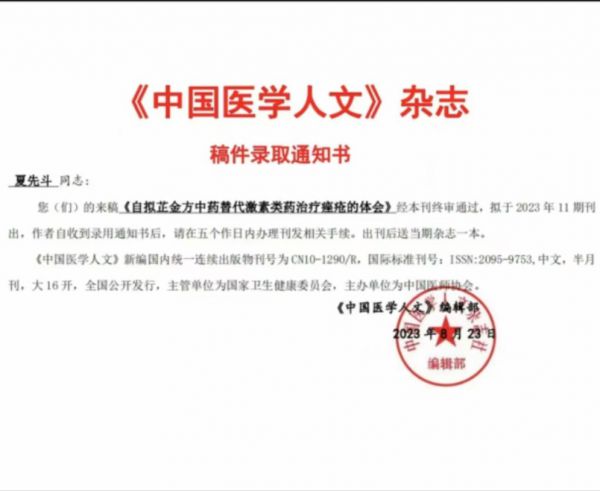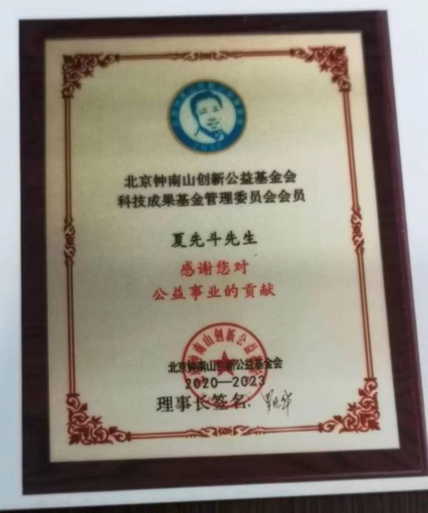 该中医药预防新冠病毒感染性肺炎建议处方提交国家中医药管理局科技司办公室于文俊老师收后,于老师于2020年2月19日微信回复,称已立即将此处方转交给了领导和专家组,并对夏先斗主任中医师给予了赞扬和热情的鼓励。2020年7月、夏先斗主任医师被北京钟南山创新公益基金会科技成果基金管理委员会吸收担任会员,并领发证书。