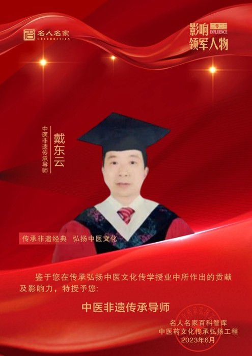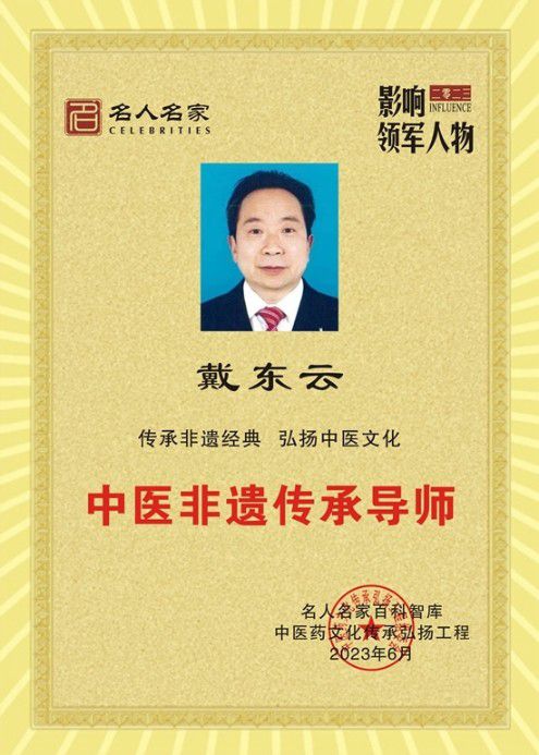 戴东云,男,1957年11月5日生于医学世家,戴氏医学第三代传人,四川省三台县人,被世界中西医结合医学研究院认定、教授(证号:CN62l 4l 5711)、中西医结合医学博士(证号:SJ B0611)、自然医学科学院院士(证号:SJK0838)执业医师、药师、中华中医学会会员。中共党员,大专文化,中西医结合外科医师,毕业于内蒙古医药专修学院中医专业、川北医学院中西医结合专业。