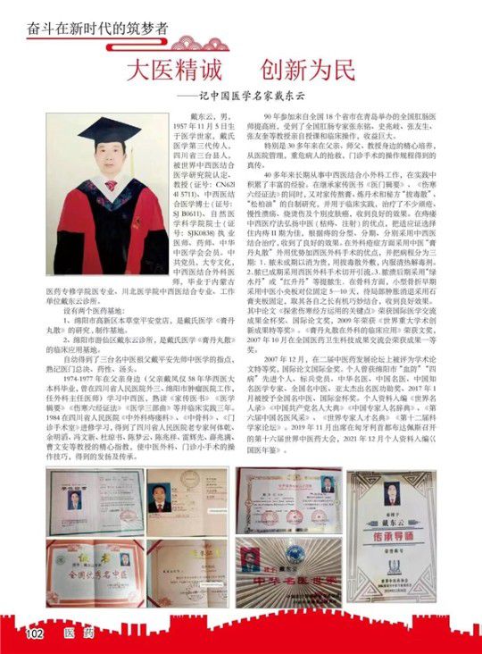 拥有膏丹丸散的研究基地本草堂平安堂,膏丹丸散的临床基地绵阳市游仙区戴东云诊所。在外科疮症方面采用中医“膏丹丸散”外用优势加西医外科手术的优点,并把病程分为三期:1.脓未成期以消为贵,用拔毒散外敷,内服清热解毒剂。2.脓已成期采用西医外科手术切开引流。3.脓溃后期采用“绿水丹”或“红升丹”等提脓生.在骨科方面,小型骨折早期采用中医小央板对位固定5—10天,待局部肿胀消退采用石膏夹板固定,取其各自之长有机巧妙结合,收到良好效果。其中论文《探索伤寒经方运用的关键点》荣获国际医学交流成果金杯奖、国际论文奖,2009年荣获《世界重大学术创新成果特等奖》。《膏丹丸散在外科的临床应用》荣获文奖,2007年10月在全国医药卫生科技成果交流会荣获成果一等奖。