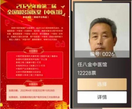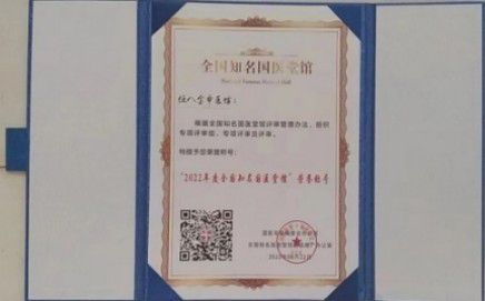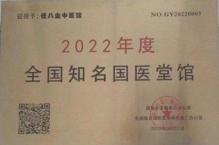 2022年8月22日《任八金中医馆》被中国“国医年鉴编委会办公室,全国知名国医堂馆评选推广办公室”授予《全国知名国医堂馆》在全国评选排名第四。