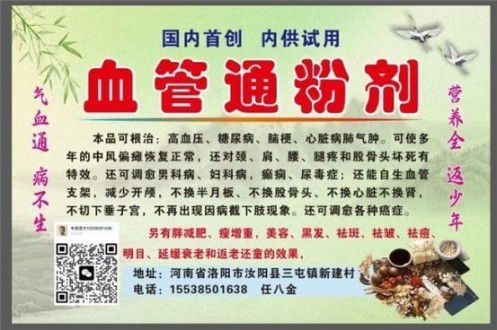 《血管通粉剂》可以根治:高血压、糖尿病、尿毒症、脑梗、心脏病、气管炎、肺气肿、肺大泡、慢阻肺、半身麻木、中风后遗症、脑萎缩、肌肉萎缩、老年痴呆症、红斑狼疮。