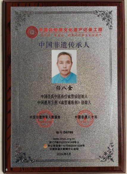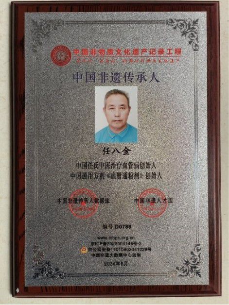 2024年5月任八金被中国非遗传承人数据库和中国非遗人才数据库收录为中国《任氏中医治疗血管病》创始人,中国通用方剂《血管通粉剂》创始人,中国非遗传承人。