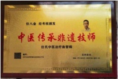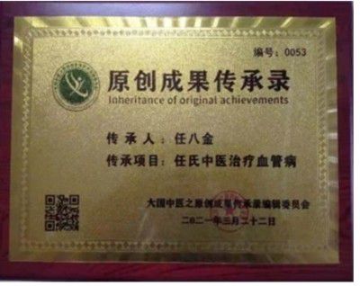 2021年3月22日《任氏中医治疗血管病》技术被中国“大囯中医原创成果传承录编辑委员会”收录,颁发了证书和牌匾,后经考核给任八金颁发了“中医传承非遗技师”证书和牌匾。