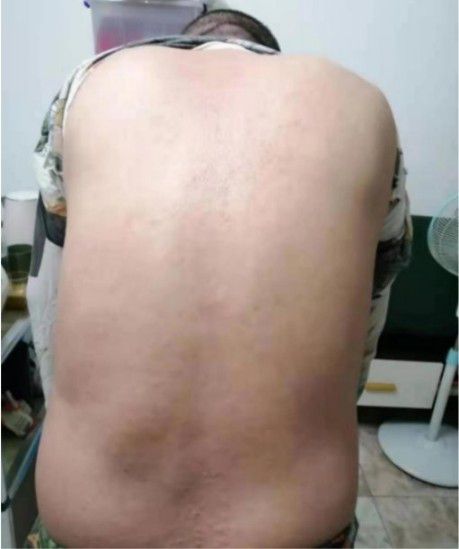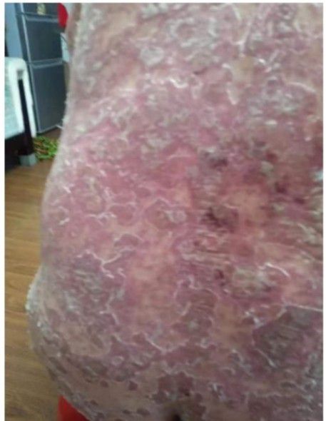 这是广西的一个牛皮癣痪患者,没用《血管通粉剂》前全身皮肤是这个样子。